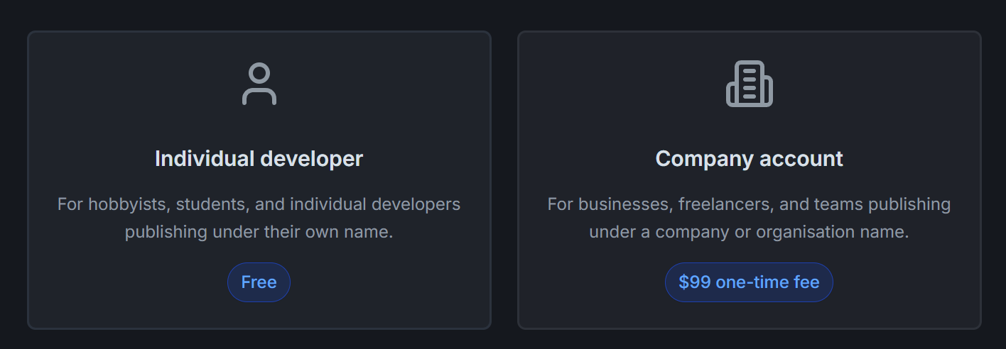 The confusing part is that Microsoft actively offers you the option to create a "work account" during sign-up, but that account type apparently can't enroll in the Windows developer program. There's no error message telling you this — you just hit a brick wall.