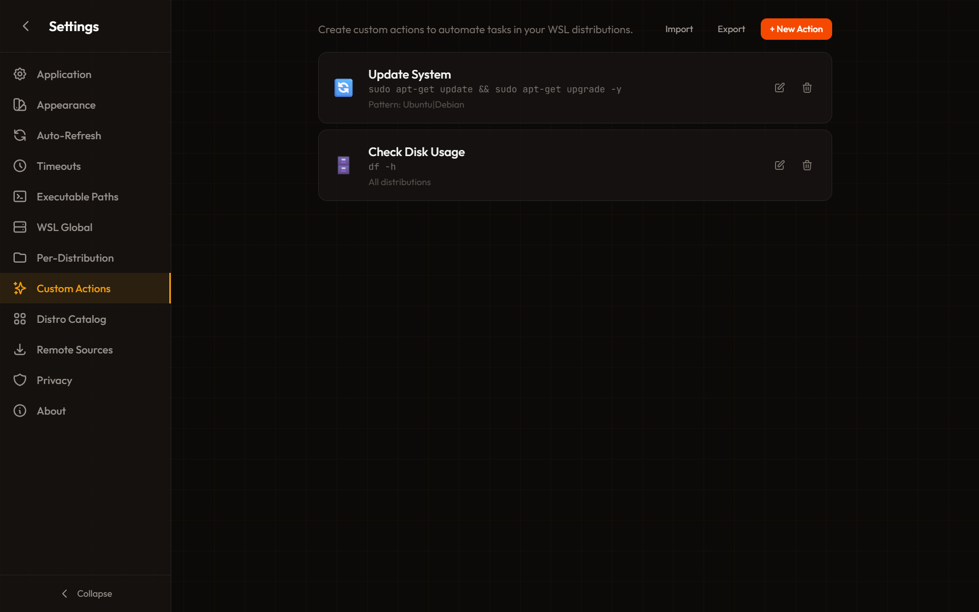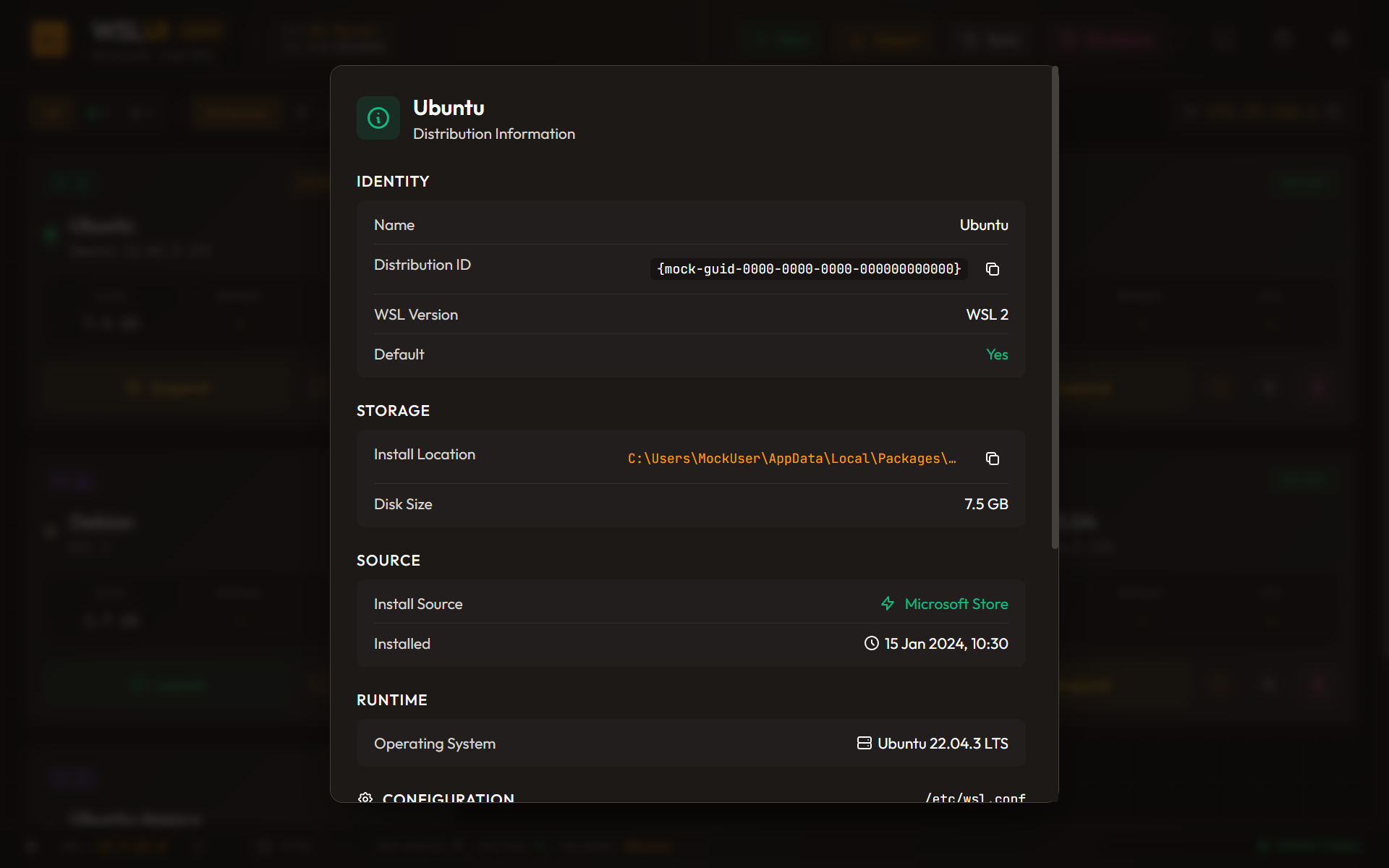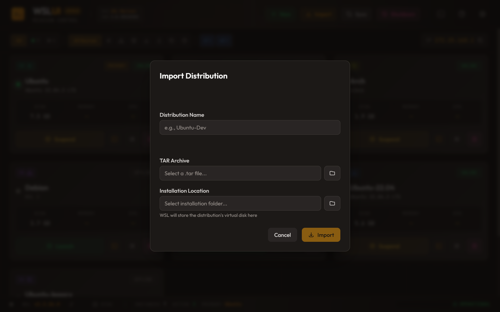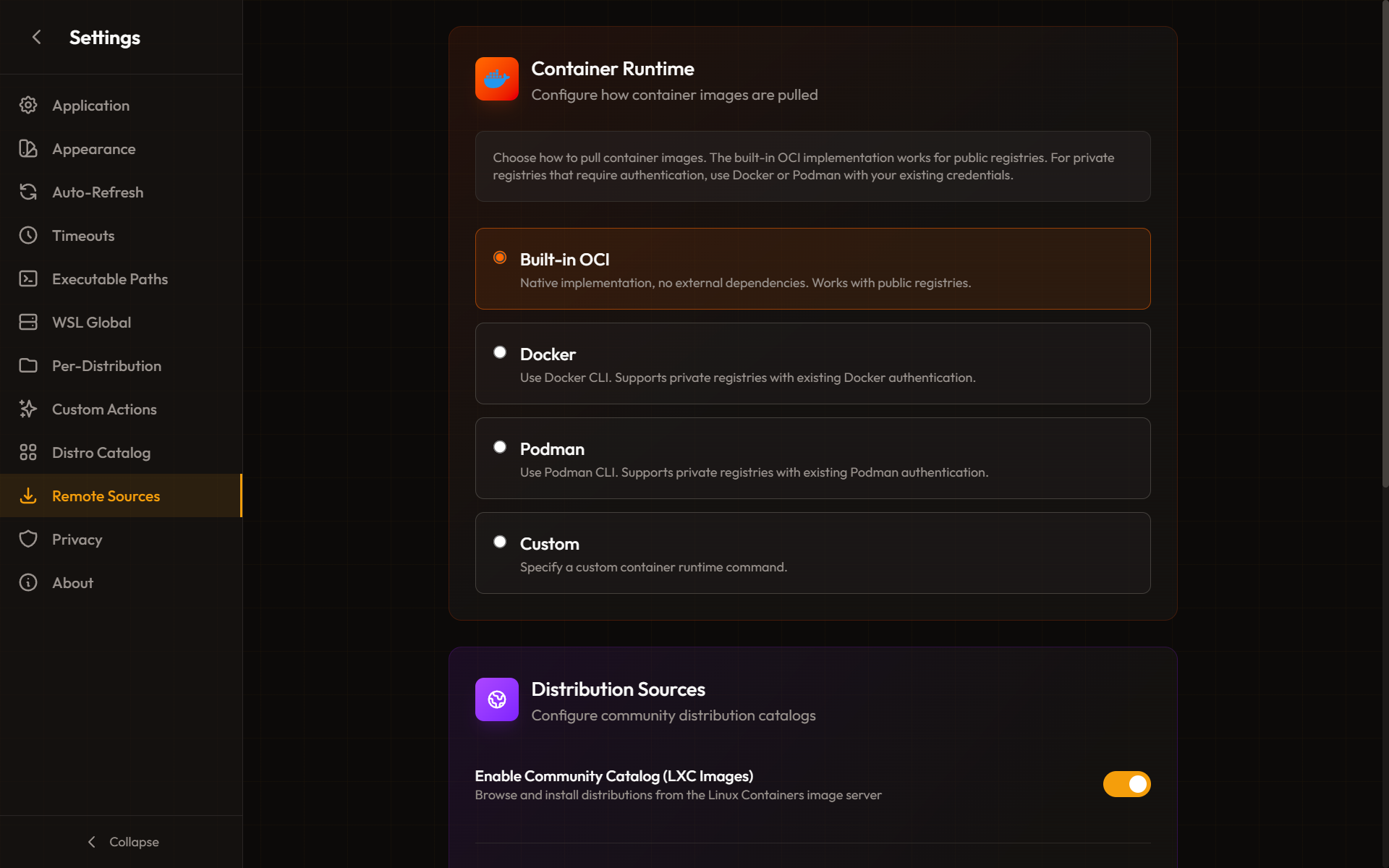 Create distributions from Docker or Podman images. WSL UI includes a built-in OCI implementation - no Docker installation required.