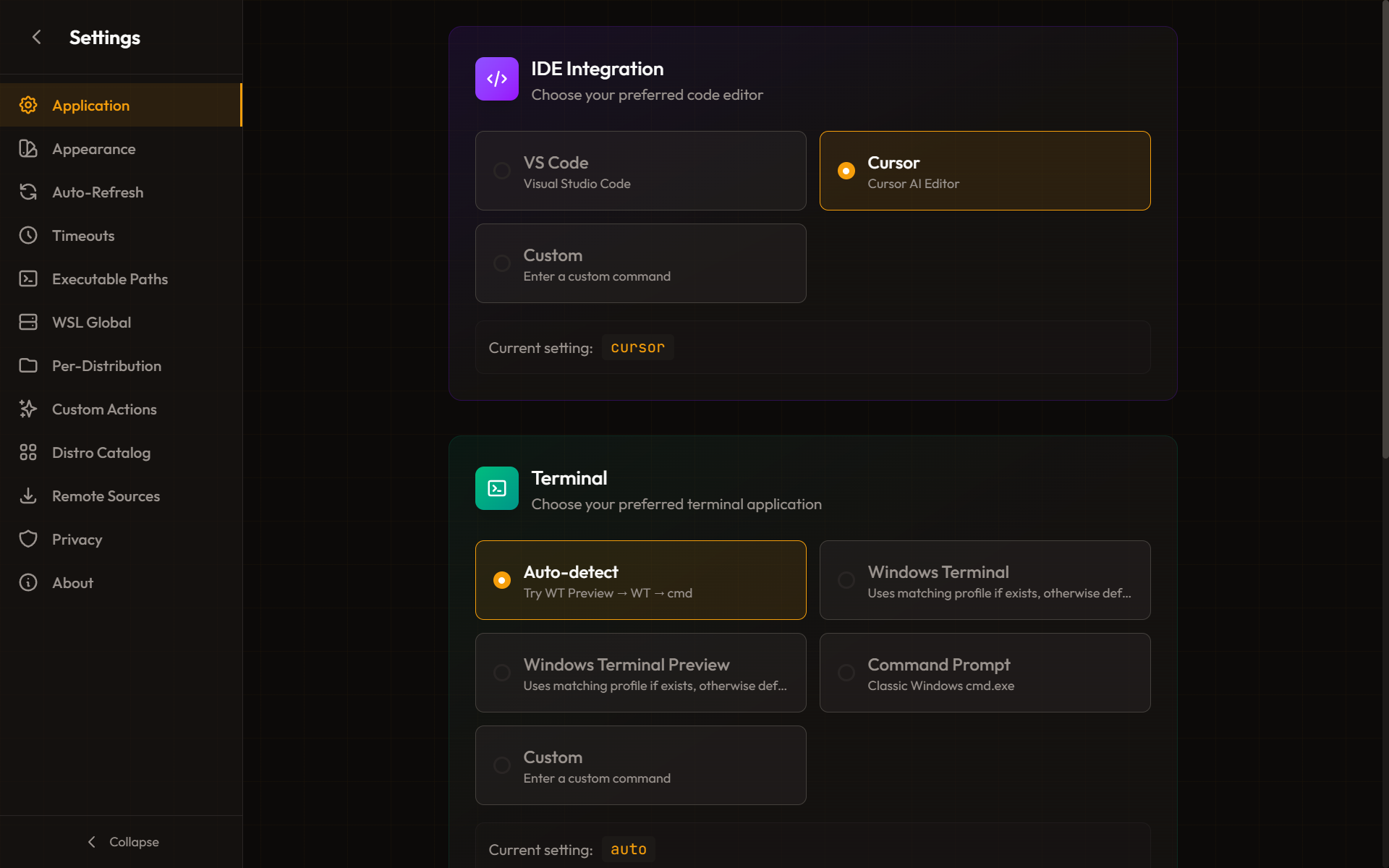 Configure your preferred terminal and IDE, startup behavior, and system tray options.